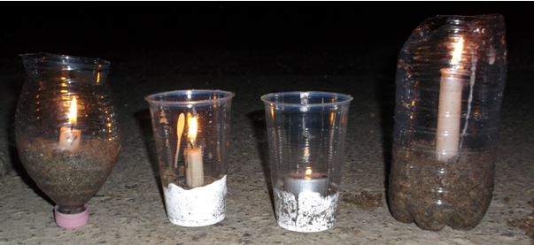 Vegyünk elő egy műanyagpoharat vagy készítsünk poharat PET palack levágásával. Ebbe helyezzük bele a gyertyát, szórjunk mellé homokot 2-3 cm vastag rétegben, és máris kész az úszó gyertyánk. Itt néhány példa: