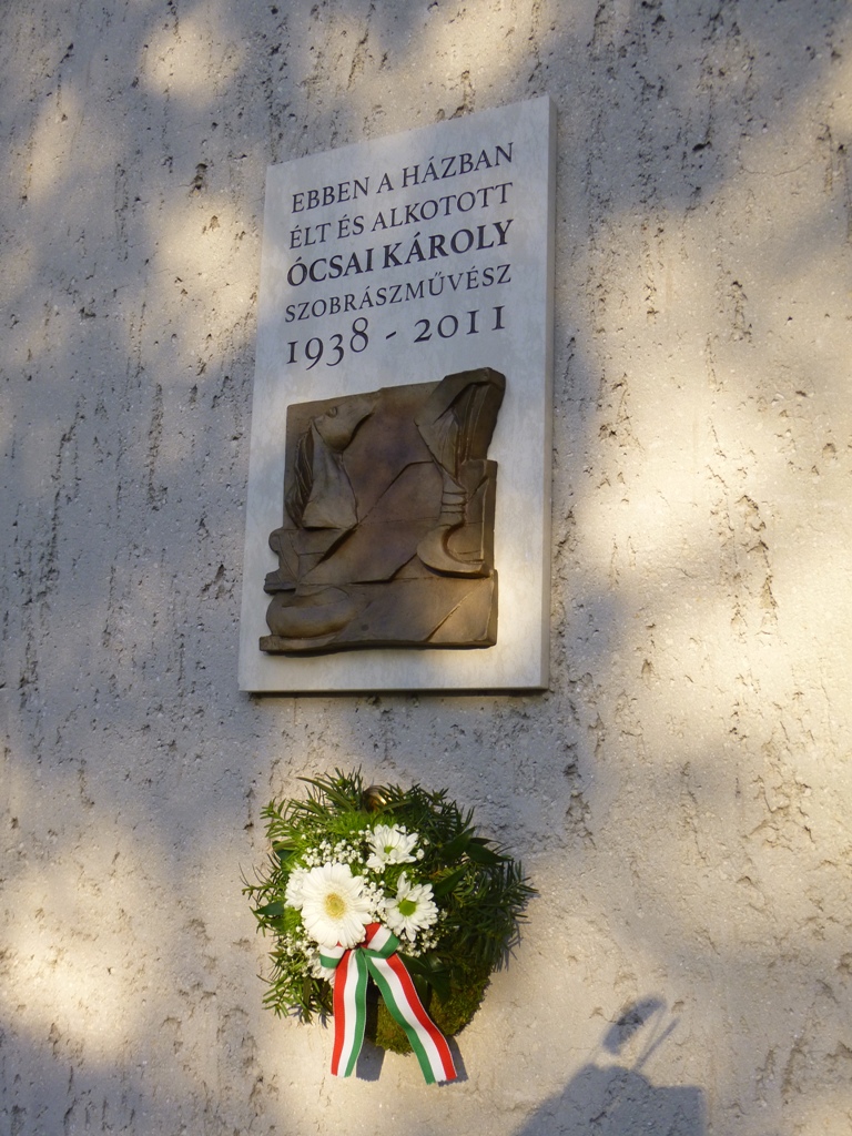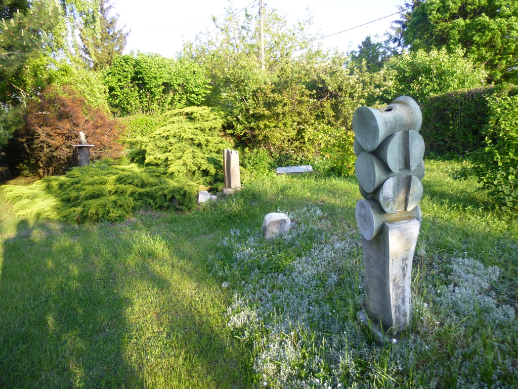 A kertben is több műve van, melyek állapota romlik, ill. néhányat innen be kellett menteni. Itt koszorút helyeztünk el emléktáblájánál a műterem falán.