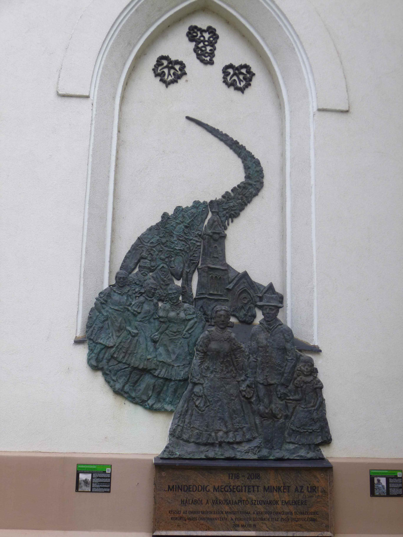 7. Dombormű a templom falán, a betelepülő szlovákság emléke